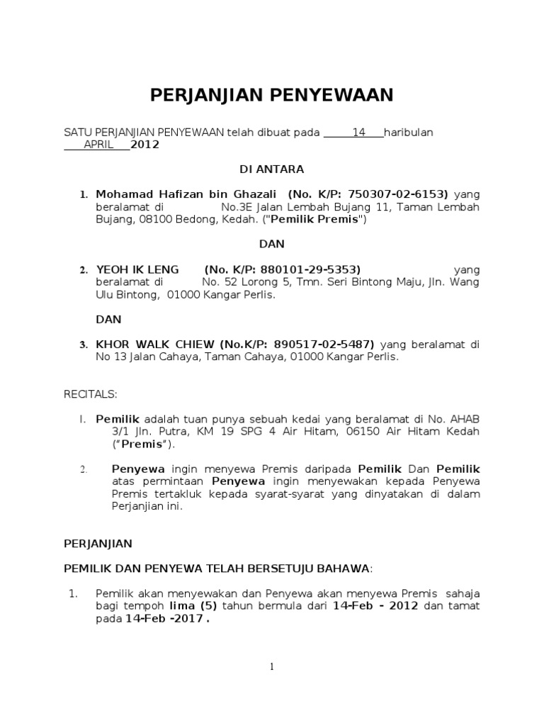 Surat perjanjian kedai sewa surat perjanjian ini diperbuat pada 1 september 2011 di antara. Perjanjian penyewaan bahasa malaysia 2 penamafirmasyarikat yang butirannya ada dinyatakan dalam perkara 2 lampiran a selepas daripada ini. Tuan saya nk tanya kalau premis perniagaan yg kita bagi sewa tiada surat perjanjian dan saya nak tamatkan sewaan kedai sebab dah.
